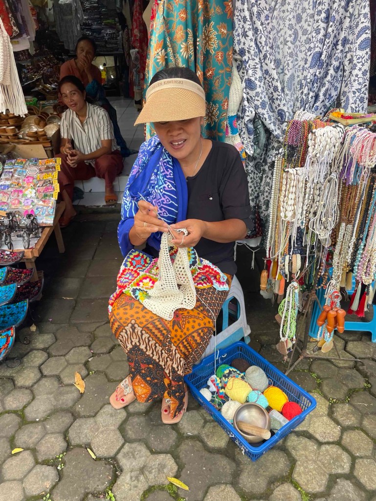 On the way back to the parking lot, of course, we were funneled through a gauntlet of pushy vendors eager to offload their cheap China goods. Unpleasant. But then I spotted a woman sitting in front of her stall, crocheting. I was impressed, so I struck up a conversation. I told her I also do handwork and asked if yarn was sold in Bali and where. Without hesitation, she brought out her yarn – and I couldn’t resist. I’ve done it again: bought yarn, even in Bali! I could have bargained, of course, but I found it remarkable that she actually made her own goods.