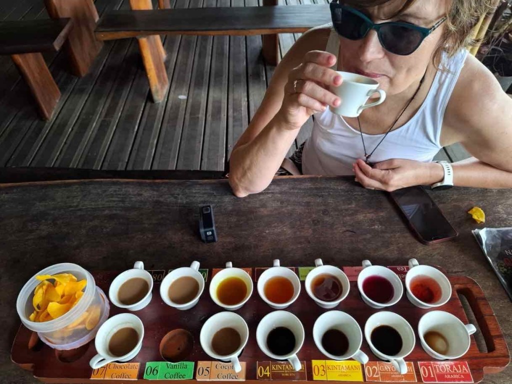 Es gibt verschiedene Sorten – männlich und weiblich – die weibliche schmeckt milder. Dazu gab es eine ganze Palette weiterer Kaffees und Tees zur Verkostung. Die Zubereitung des Luwak-Kaffees erfolgte direkt am Tisch. Ehrlich gesagt: Er schmeckte gut, aber kein geschmackliches Feuerwerk. Im Shop mit sämtlichen Sorten haben wir schließlich nichts gekauft – sehr zum Ärger unserer Führerin, die uns vielleicht mit etwas mehr Enthusiasmus eher zum Kauf gebracht hätte.
