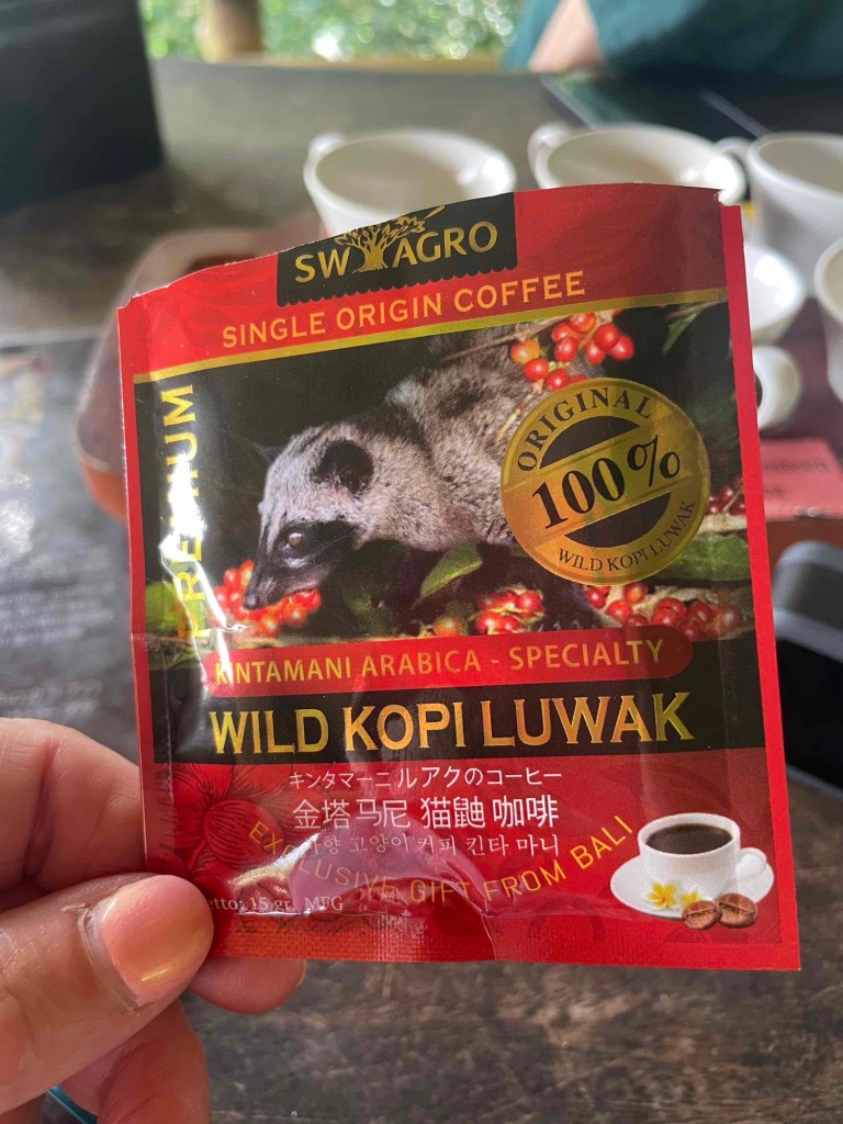 There are male and female varieties – the female one tastes milder. They also offered an entire range of coffees and teas for tasting. The luwak coffee was prepared right at our table. Honestly: it tasted good, but it wasn’t exactly a thunderclap of flavor. Finally, we were led into the shop stocked with every type of coffee and tea, but we didn’t buy anything – much to our guide’s annoyance. Perhaps a bit more enthusiasm on her part would have helped.