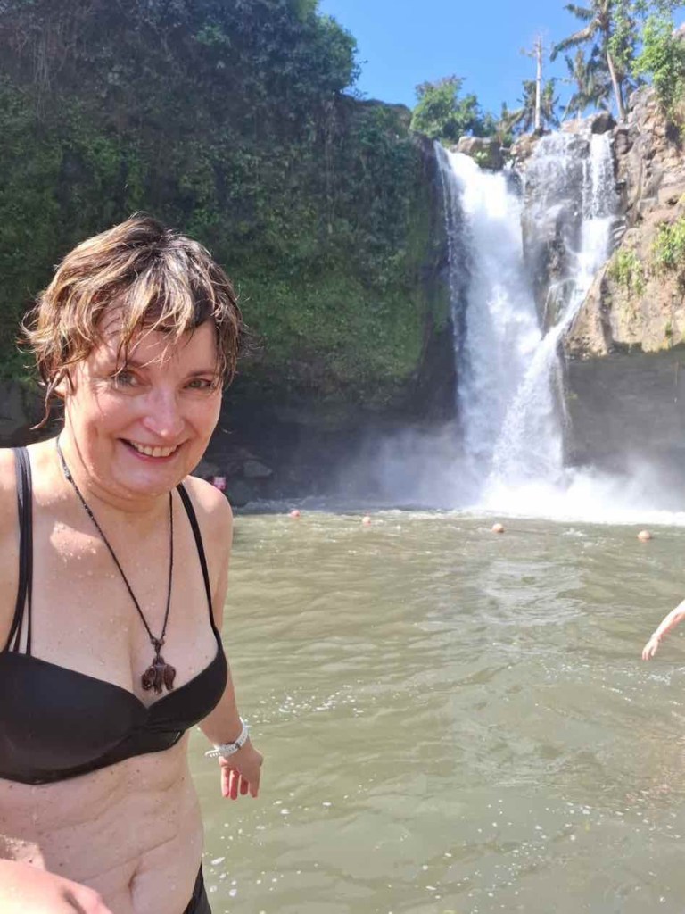 Noch ein Touristen-Hotspot. Wayan ließ uns allein erkunden und gab uns 90 Minuten Zeit. Über Treppen ging es am „Baby-Wasserfall“ vorbei hinunter zum großen Wasserfall. Baden möglich. Eigentlich wollte ich nur zuschauen, ließ mich dann aber überreden. Vorsichtig tastete ich mich über die Steine ins kühle Nass – herrlich erfrischend. Anschließend suchten wir uns ein Restaurant mit Blick auf den Wasserfall, bestellten eine Kleinigkeit und genossen die Aussicht. Wenn das keine spirituelle Reinigung war!