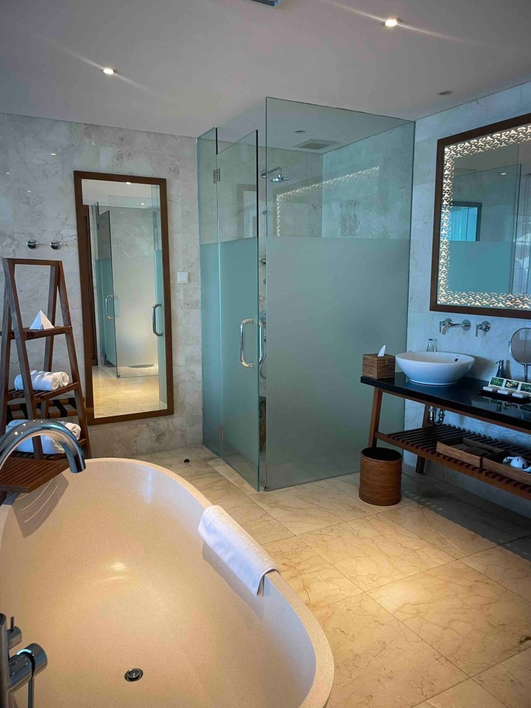 We were greeted with a bottle of sparkling wine. Luxury Suite – every imaginable comfort included. The only thing more exclusive would have been a private villa with pool. But we prefer to swim in the ocean: clean water, plus three infinity pools and three restaurants. Everything is taken care of.
