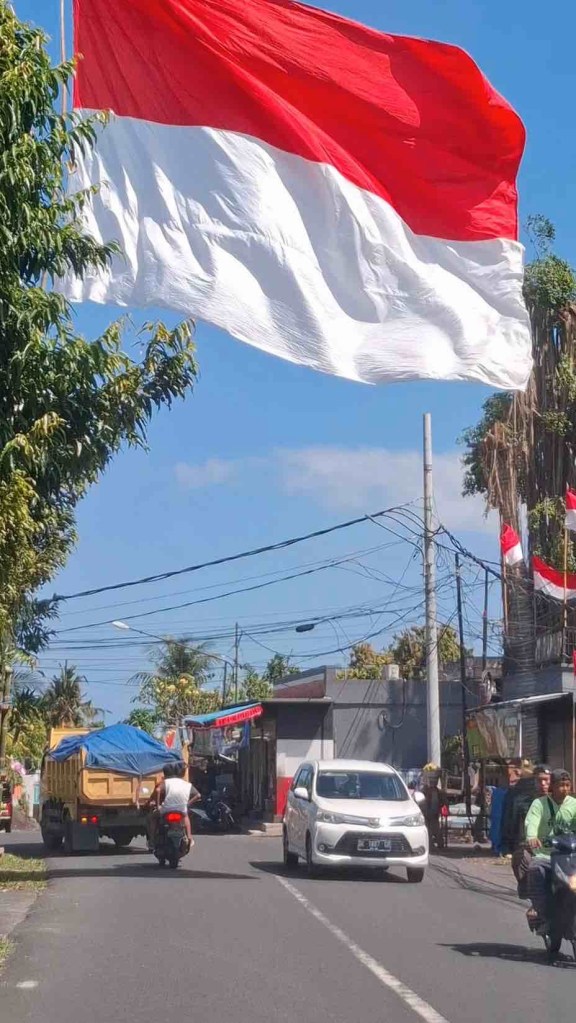 Tomorrow is Indonesia’s Independence Day. The streets are decorated in red and white – the colors of the national flag. On the roadside: lively activity. Everything is being sold, including colorful chicks. Alive, mind you. According to Wayan, they dye them for children.