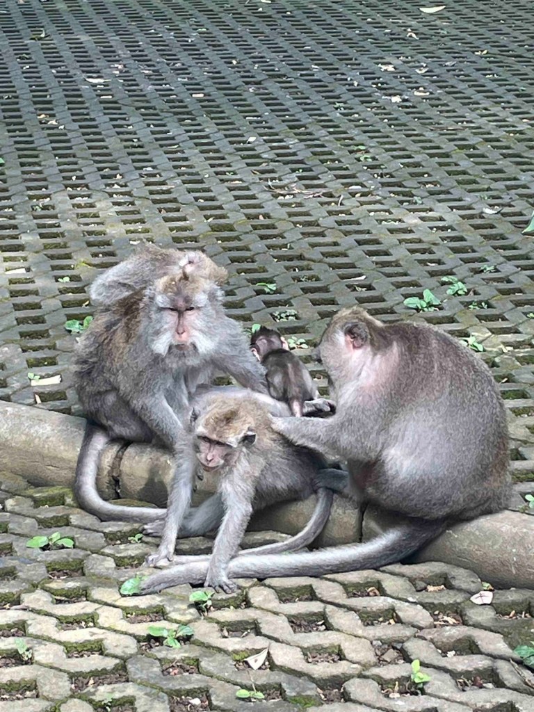 On the way to East Bali we made a detour to the Sacred Monkey Forest, which we hadn’t been able to enter the day before yesterday. Wayan drove us there, and we explored the grounds and the temples – though the temples themselves can only be viewed from outside. I had imagined the forest to be wilder. Instead, it’s a tourist attraction with entrance fees and rules. The monkeys mostly looked bored. When a few did show off their climbing skills, swarms of tourists gathered immediately. Photo, photo with monkey … exhausting.