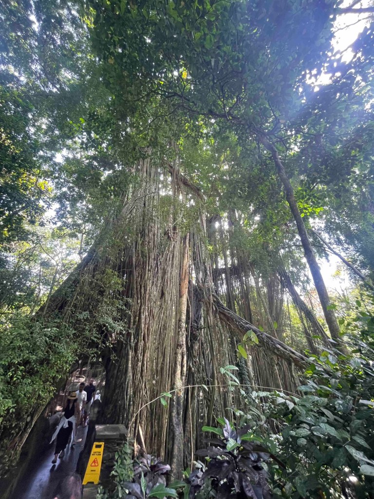 Auf dem Weg nach Ostbali machten wir einen Abstecher in den Heiligen Affenwald, den wir vorgestern nicht mehr betreten konnten. Wayan steuerte direkt dorthin, und wir erkundeten das Gelände samt Tempeln – letztere darf man jedoch nur von außen betrachten. Ich hatte mir den Wald wilder vorgestellt. Stattdessen ist es eine Touristenattraktion mit Eintritt und Vorschriften. Die Affen wirkten größtenteils gelangweilt. Zeigten sie doch mal ihre Kletterkünste, sammelten sich sofort Scharen von Touristen. Foto, Foto mit Affe … ziemlich anstrengend.