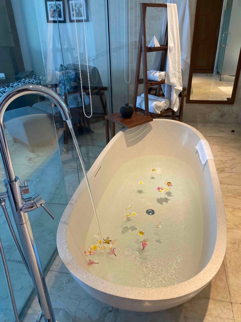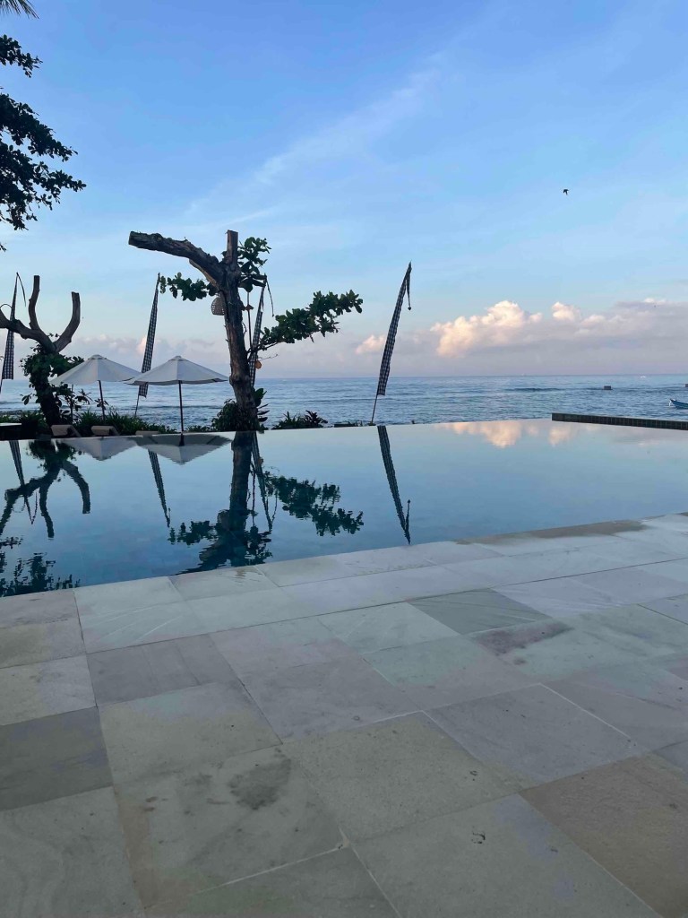 Wake up, yoga on the rooftop terrace or the private terrace, an extended breakfast (almost a brunch), diving into the infinity pool or the ocean, reading, a drink at the pool bar, collecting frangipani blossoms and sprinkling them in the jacuzzi. When did I ever have such a vacation? I can’t remember. It almost sounds decadent. The room was cleaned twice a day: once in the morning and once in the evening, with the bed fluffed and the curtains drawn again. But we actually prefer sleeping with the window open – even if the sound of the waves was a bit louder. In the morning, however, we still closed it, because after the birdsong, smoke from nearby fires drifted in and spoiled the air. (There’s no garbage collection here. Balinese people burn their trash in the garden.)