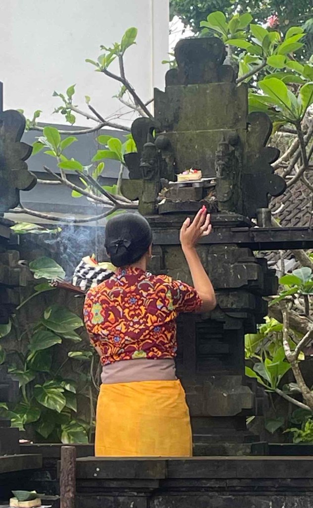 Aufstehen, Yoga auf der Dachterrasse oder auf der eigenen Terrasse, ausgedehntes Frühstück (fast schon Brunch), Abtauchen im Infinity-Pool oder im Ozean, Lesen, ein Drink an der Poolbar, Frangipaniblüten sammeln und im Jacuzzi verteilen. Wann hatte ich jemals einen solchen Urlaub? Ich kann mich nicht erinnern. Es klingt fast schon dekadent. Das Zimmer wurde zweimal am Tag gereinigt: früh morgens und am Abend wurde noch einmal das Bett aufgeschüttelt und die Vorhänge zugezogen. Dabei schlafen wir doch lieber bei offenem Fenster – auch wenn das Meeresrauschen etwas lauter war. Morgens schlossen wir es trotzdem, denn nach dem Vogelgezwitscher stiegen Rauchschwaden aus der Nachbarschaft auf und verdarben die Luft. (Eine Müllabfuhr gibt es hier nicht. Der Balinese entsorgt seinen Abfall per Feuer im Garten.)