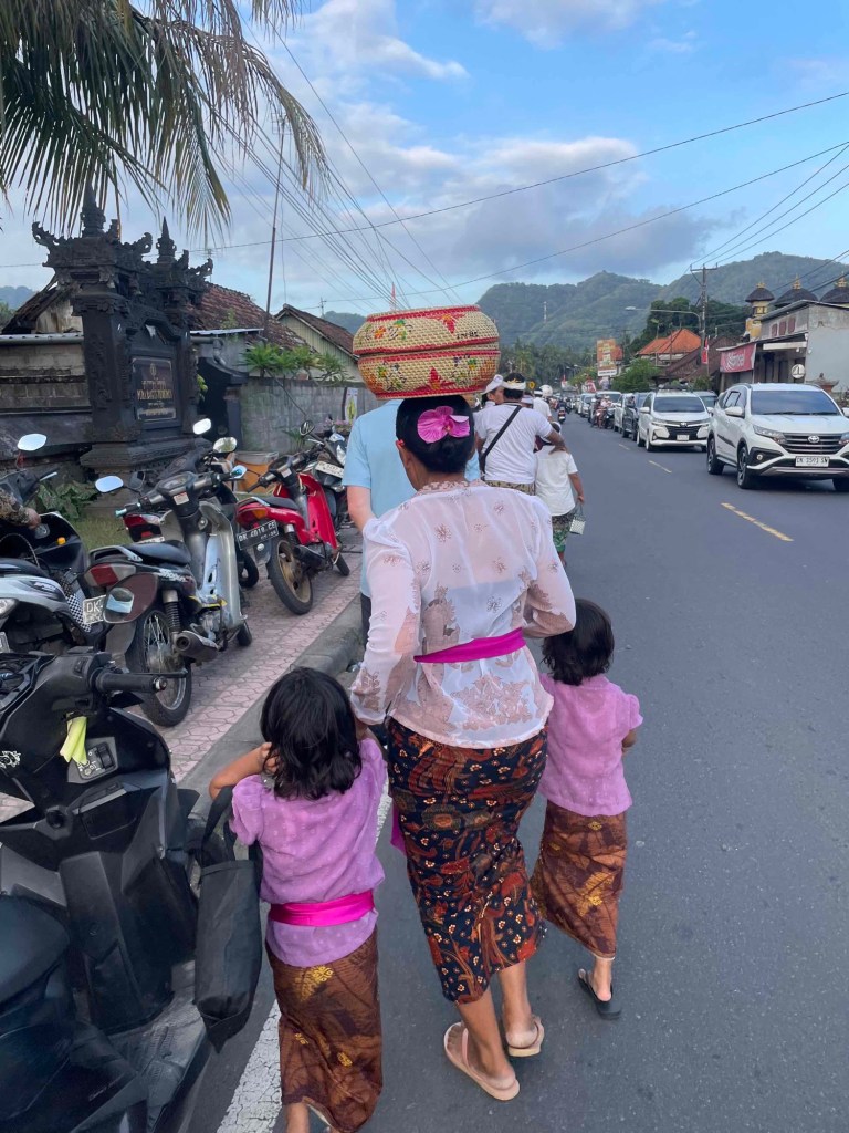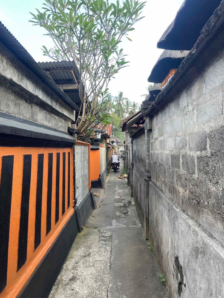 Im Hotel wurden zwei Wanderungen angeboten, am Morgen und am späten Nachmittag. Mit Sinta „wanderten“ wir 50 Höhenmeter hinauf ins Dorf, durch einen Bananenwald und erfuhren einiges über Bali. Zum Beispiel, dass die Bananen dort ungenießbar sind – wusste ich gar nicht! Wir kamen an Bauernhöfen vorbei, wo Kühe weideten, Hühner über die Straße liefen und ein Hahn vom Dach krähte.