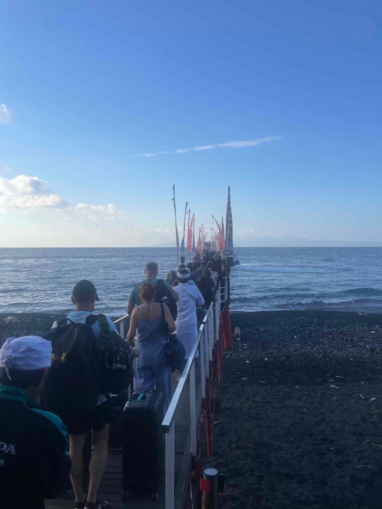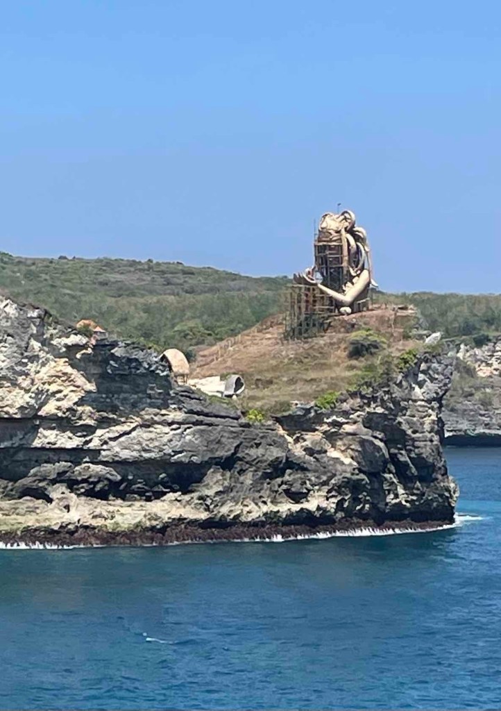 Der letzte Halt war Kelingking Beach. Was soll ich sagen?! Malerisch, wunderschön. Weißer Strand, tiefblaues Wasser – einfach traumhaft. Leider völlig überlaufen. Insta-Hotspot eben. Vor allem Chinesinnen in flatternden Kleidchen, die nach DEM Foto jagten. Doch das Bild wurde durch einen riesigen Kran zerstört – ein chinesisches Unternehmen baut hier tatsächlich einen Fahrstuhl hinunter zur Küste. Für uns unverständlich. Damit ruiniert man diese atemberaubende Aussicht, und von der Idylle bleibt kaum etwas. Wer Zeit hat, kann in 45 Minuten zum Strand hinunterwandern – und braucht entsprechend länger, um wieder hochzukommen. Uns fehlte die Zeit, unser Boot fuhr um 16 Uhr zurück.