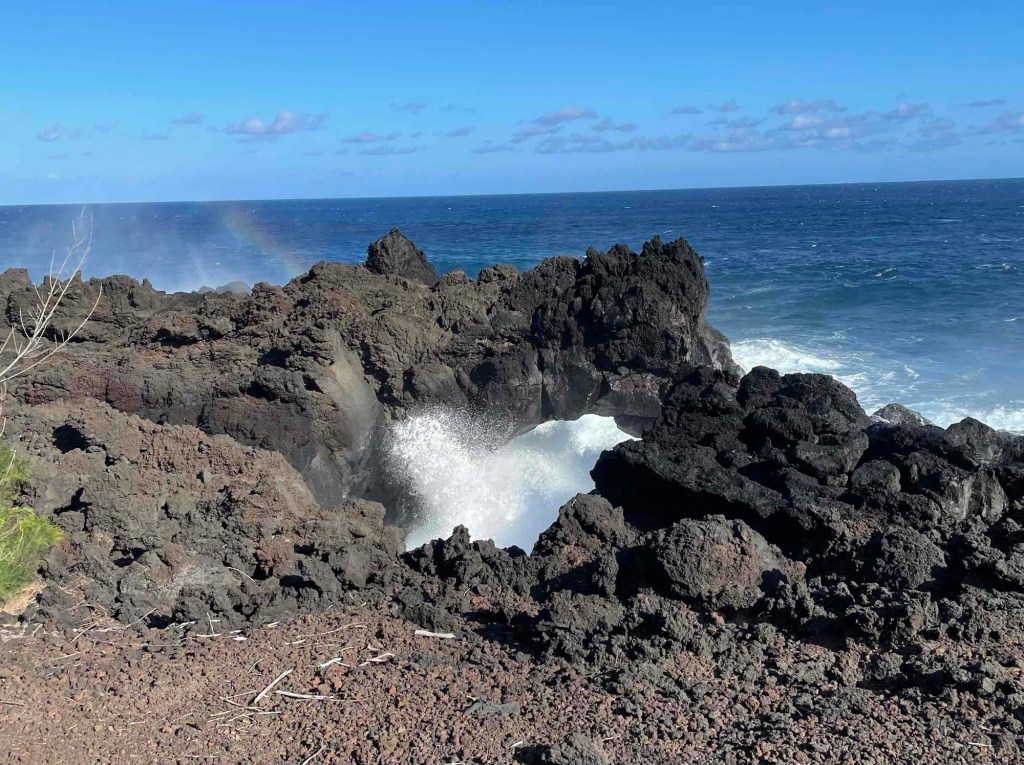 After a varied drive along the coast, the landscape suddenly changed: a wild shoreline, huge waves crashing against the black cliffs, mist and spray everywhere. It grew greener and greener, especially on the left-hand side. The volcanic region began. Colorful little houses along the roadside reminded us that we were in Africa. We couldn’t get enough of the views — every corner was worth seeing. Our sighs along the way — and really throughout the trip so far — were almost prize-worthy.