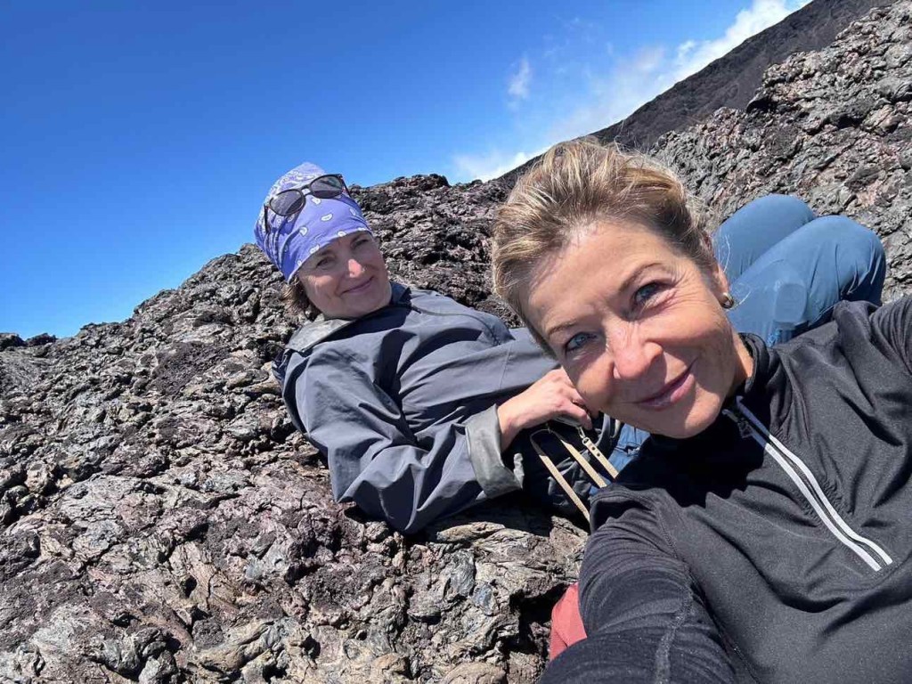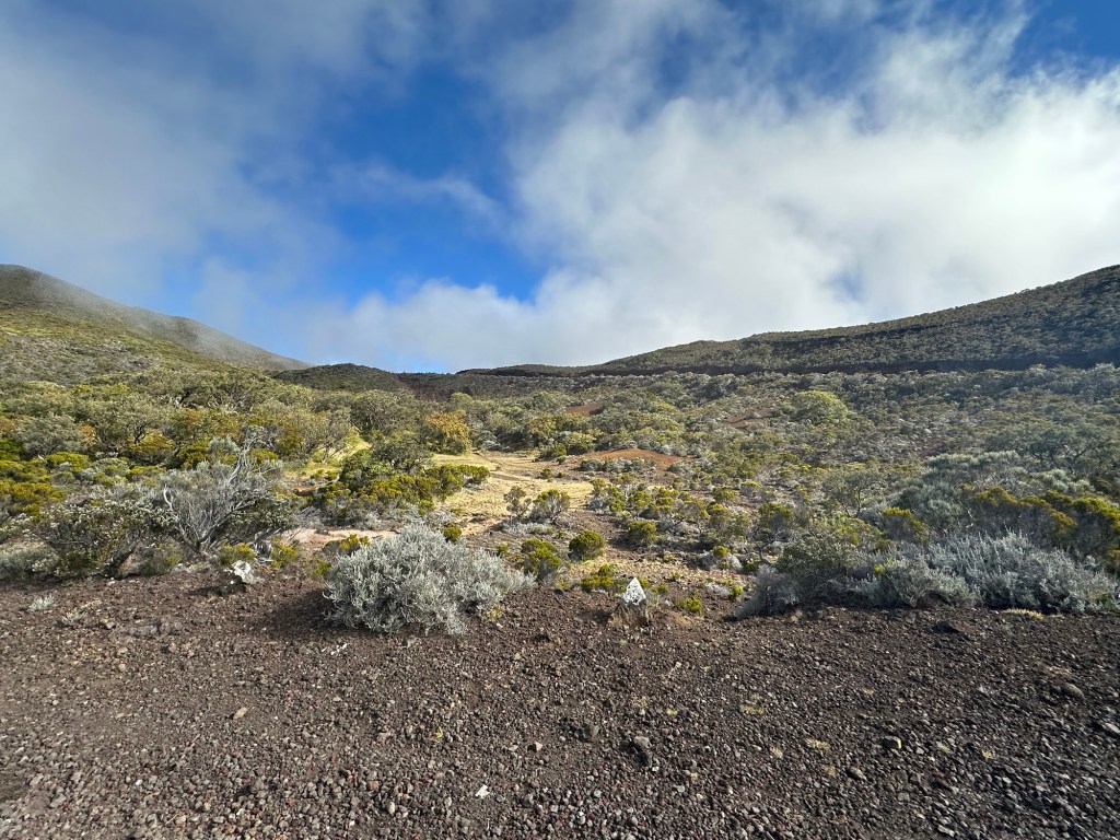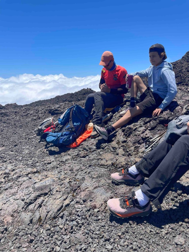 As we approached the final climb back to the parking lot, the weather held up. The forecast hadn’t been reliable – it was supposed to rain in the afternoon. Lucky us! Now we could enjoy the full spectacle: an explosion of colors in the volcano – blue sky, white mist drifting back in, shades of anthracite, red, and green, and that enormous volcano. We’d been up there! Now for the last climb.