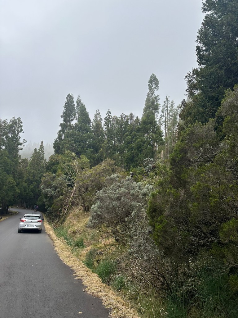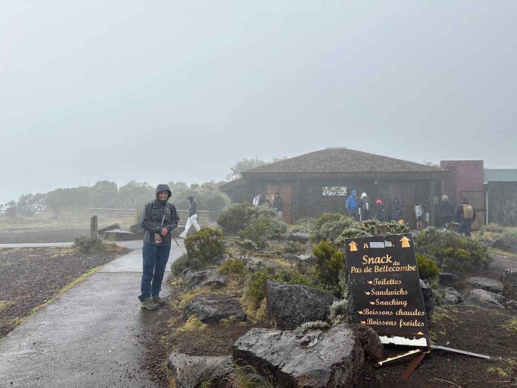 On the long descent into the Enclos, there was plenty of traffic in both directions. Soaked volcano climbers were coming towards us. Had they had enough already? Maybe. But most of them had probably come to watch the sunrise – in the fog?