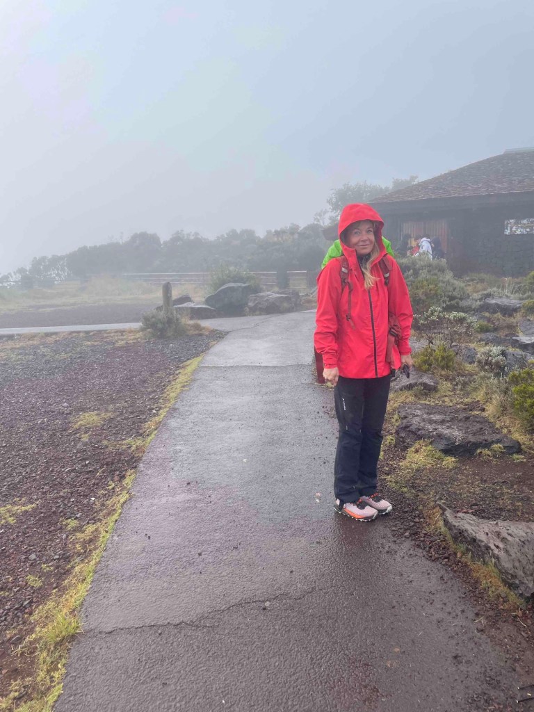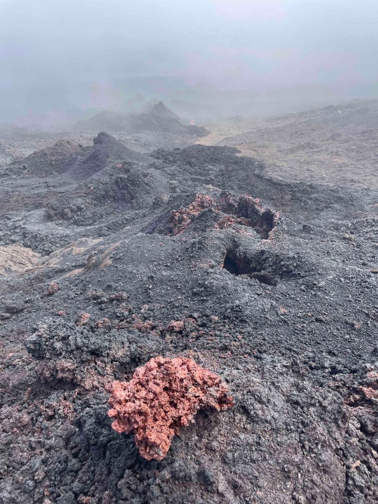 No spectacular sunrise. The alpine-like landscape at the foot of the volcano was wrapped in fog – which only grew thicker. Rain on the volcano. What a pity. Still, it had its own charm. We put on everything we had with us and waited in the rain.