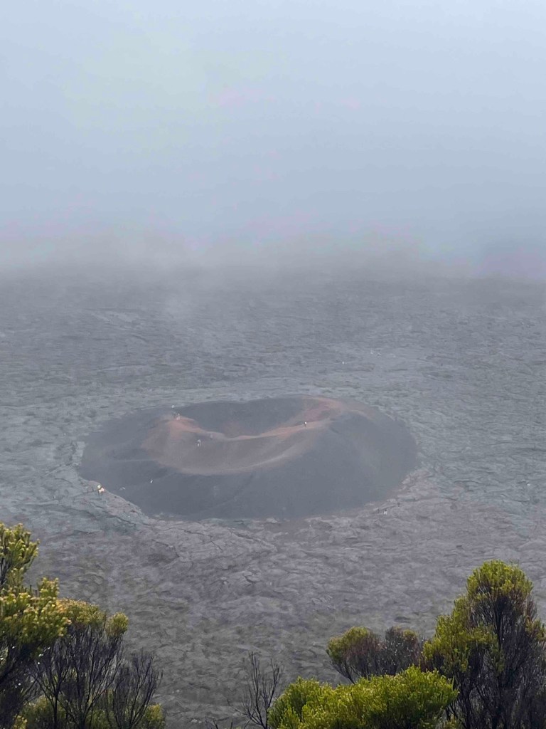 Et quoi d’autre ? Nous sommes restés sur le sentier officiel, balisé de gros points blancs sur les roches de lave. Deux ou trois fois, nous avons pu quitter la route pour contourner les coulées menant vers le cratère du Dolomieu. Nous n’avons pas longé le grand tunnel de lave ni les « cathédrales », mais d’autres tunnels plus petits. Plus nous approchions du cratère, plus le brouillard se dissipait. Les formations de lave et l’horizon infini de l’Enclos sont enfin apparus.