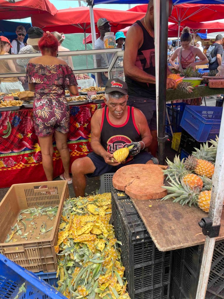 The market stretches along the entire waterfront in several rows: first clothing, then all sorts of handicrafts, followed by fruit, vegetables, and spices. We browse everything, leave no stall unexplored, yet end up finding no suitable clothes. Instead, we replenish our fruit supplies – finally, mangoes! We grab four pineapples and some bananas. We don’t find clothes or bikinis, but we do discover pretty hair accessories like clips and ribbons. Overall, the atmosphere is wonderfully relaxed – no pushy sales tactics, no stress, just friendly traders.