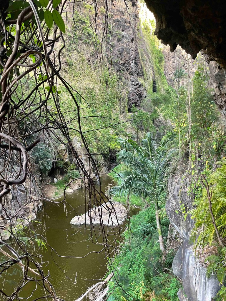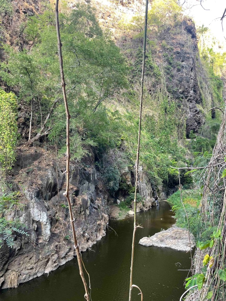 Bevor es in die Ravine geht, ziehen wir unsere „Kampfanzüge“ an und besprühen uns gründlich mit Nobite – Mückenschutz von Kopf bis Fuß. Das Gras steht zwar noch nicht nabelhoch, aber schon stehendes Wasser reicht, um die Plagegeister anzulocken. Der Pfad führt gefährlich am Hang entlang, vorbei an Felsvorsprüngen, von denen Lianen herabhängen, über Wurzeln und umgestürzte Bäume. Am Ende eröffnet sich der Blick auf den Wasserfall in der Schlucht – ein Garten Eden, in dem man sich ganz klein fühlt.