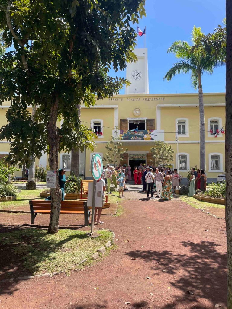 Anschließend durchqueren wir die Stadt in Richtung Hôtel de Ville (Rathaus). Überall kleine Läden, leider geschlossen – Siesta! Doch vor dem Rathaus Musik und viele Menschen. Was wird gefeiert? Eine Hochzeit! Die Gesellschaft verlässt gerade das Gebäude, und die nächste steht schon bereit. Während die erste bunt und farbenfroh erscheint, hat die folgende einen Grünton: alle Frauen in grünen oder gold- und silberglitzernden Roben. Die Braut sitzt eingezwängt in einem Cabrio in ihrem voluminöses Kleid. Was für ein Erlebnis – Hochzeiten auf kreolische Art!