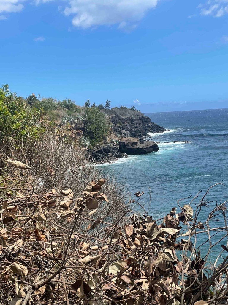 Auf der Rückfahrt halten wir im Centre Commercial Portail von Saint-Leu. Warum erwähne ich das? Weil der Supermarkt eine besondere Aussicht auf den Ozean bietet. Von dort oben erleben wir heute die Golden Hour. Und Andrea bekommt endlich ihr Kleid – an einem Kleiderstand direkt vor dem Leclerc.