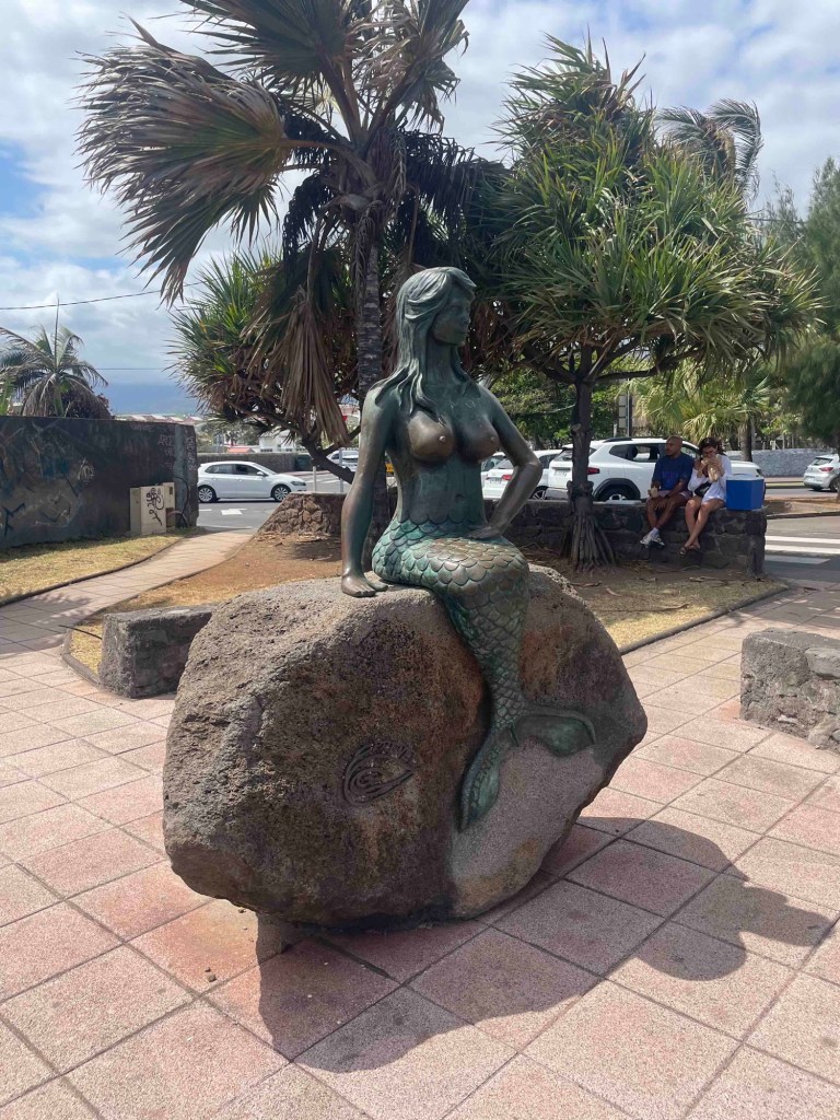 Our destination is Saint-Pierre, a somewhat larger town we only know so far for its heavy traffic and jams. So we park in one of the many lots, put on better shoes, and walk about four kilometers along the wild coast into town. The wind almost blows us over, but we’re tough. Our goal is the mermaid statue — yes, Saint-Pierre has one too, though less famous than Copenhagen’s.