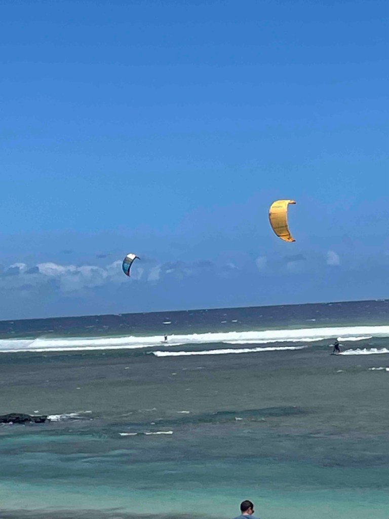 Gegenüber dem Friedhof, wie im Reiseführer beschrieben, liegt der Surferstrand. Zahlreiche Kitesurfer gleiten übers Wasser – es sieht so leicht aus.
