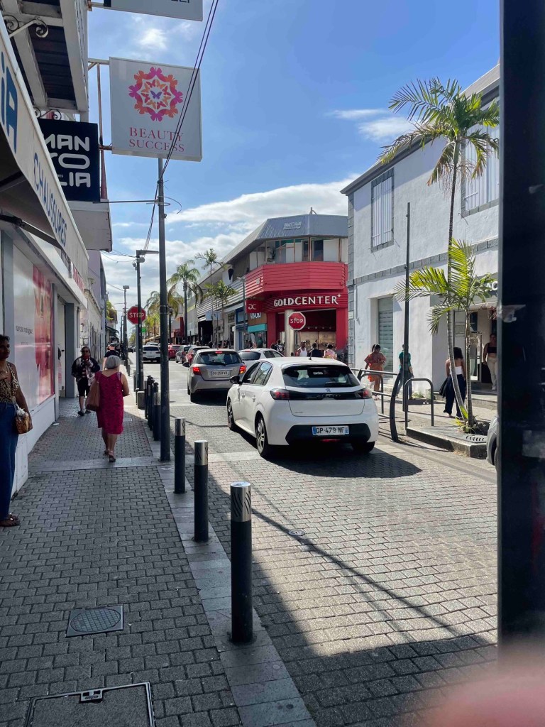 We end up in Saint-Pierre’s shopping mile. Clothing stores and shoe shops stretch for hundreds of meters. Who buys all this stuff? Andrea is still looking for a dress — but it’s always the same cheap stuff, mass-produced and uninspired. She’s about to give up. And me? Once again, I’m the lucky one — I find a pair of gorgeous sandals.