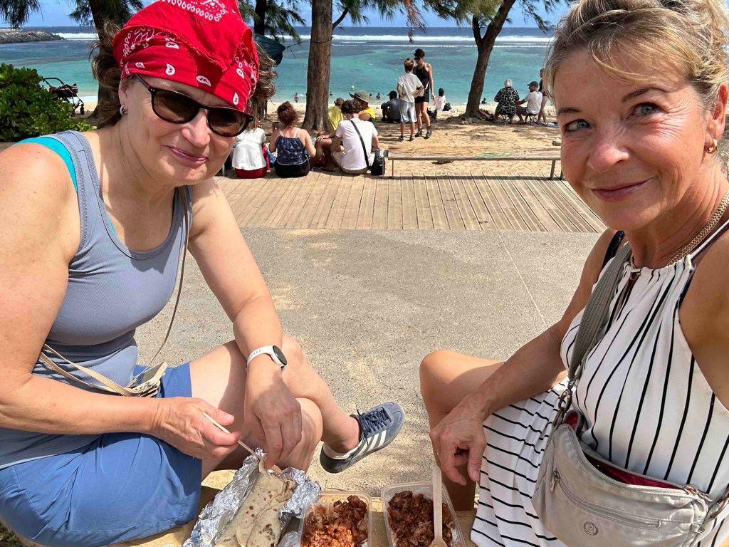 You never have to walk far before stumbling upon something unexpected: the next highlight is a fair and bazaar of the Indian community. Our lunch and dinner are sorted: butter chicken, rice, and naan. We had actually planned to eat in a restaurant, but by then it was already 2 p.m. — no more lunch service. So now we sit on the beach, gazing at the wild ocean and savoring our curry.
