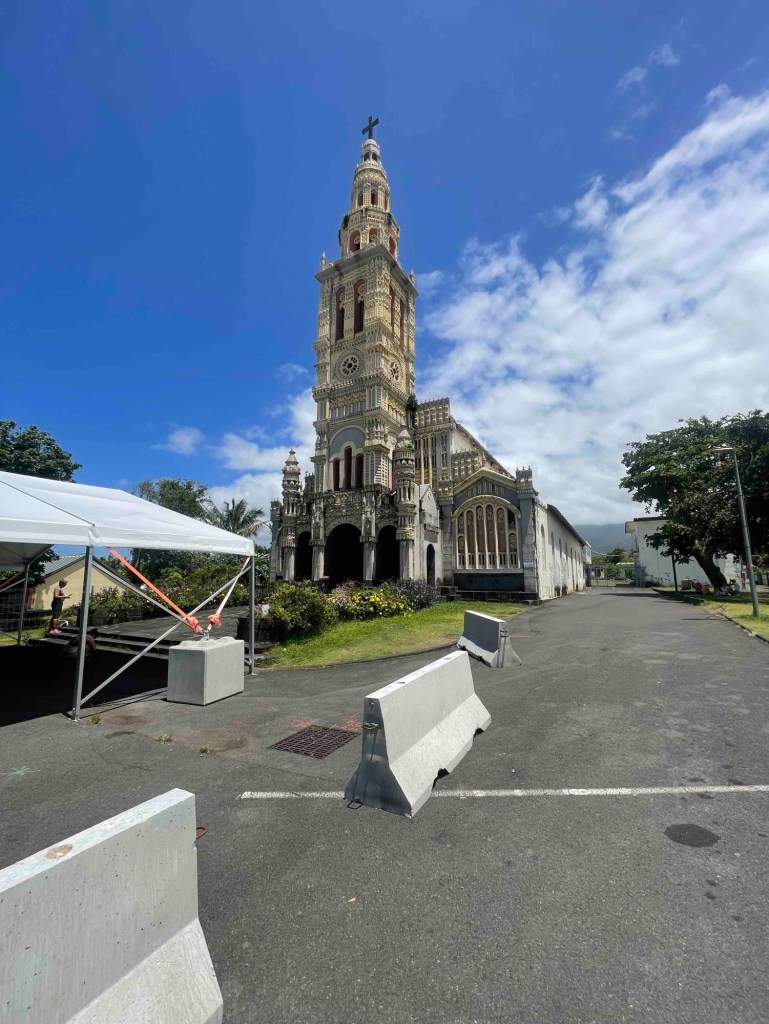 We reach the next Saint – finally a feminine one: Sainte-Anne. Its showpiece is a gorgeous little church that you can’t enter anymore since a nasty cyclone tore off parts of the roof and shattered the windows. In front of the church, they’ve set up a huge tent as a replacement.