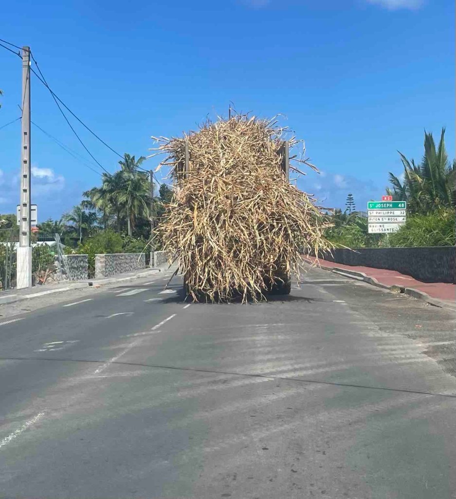 Andrea steuert unser Mädchenauto, ich navigiere uns an die verschiedensten Orte entlang der Ostküste. Traktoren und LKWs, voll beladen mit Zuckerrohr, kommen uns entgegen oder lassen uns langsam hinterher tuckeln. Das ganze Gebiet im Osten ist landwirtschaftlich geprägt: viele Plantagen – Bananen, Litschis, Mangos, Zuckerrohr über Zuckerrohr. Saftige Grüntöne und im Hintergrund der Cirque de Salazie. Wir können uns nicht sattsehen.