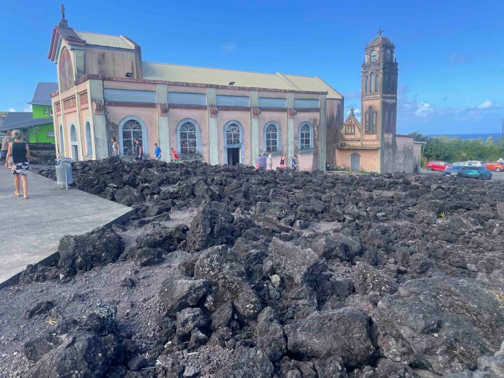 Die Kirche Notre-Dame-de-Lave liegt inmitten eines Lavafeldes. 1977 ging ein Lavastrom des Piton de la Fournaise mit einer Geschwindigkeit von 50 km/h in Richtung Sainte-Rose hinab, zerstörte ein ganzes Dorf und durchquerte die Kirche. Das Dorf existiert nicht mehr. Die Kirche hat man versucht, wieder aufzubauen. Und da steht sie jetzt – wie ein Mahnmal. Eine kleine Ausstellung erinnert an dieses Ereignis. Uns läuft eine Gänsehaut über den Rücken.