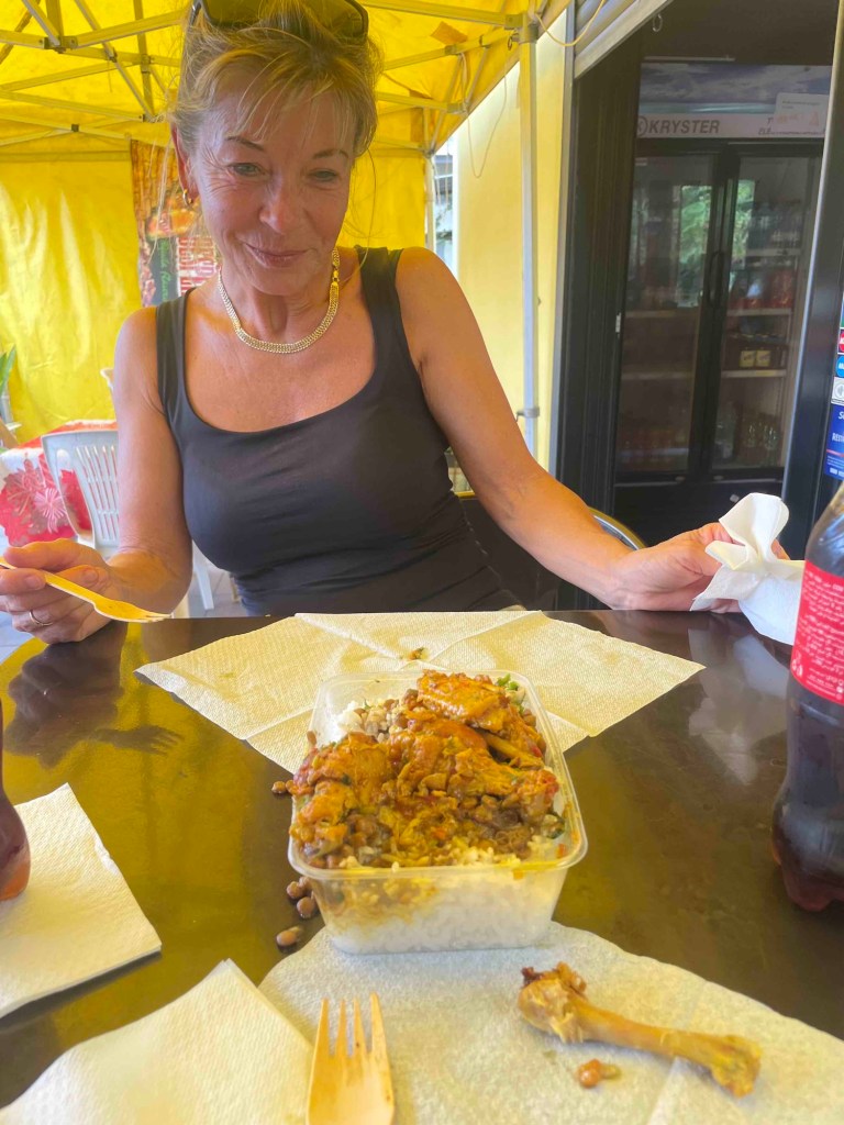Our stomachs start to growl. It’s 1:30 p.m. We’ve got half an hour left before the kitchens close. Finding a restaurant in this less touristy region turns out to be tricky. We end up in a kind of Creole snack bar. The interior is a bit rustic, but the chicken curry – a huge portion, enough for both of us – tastes great.