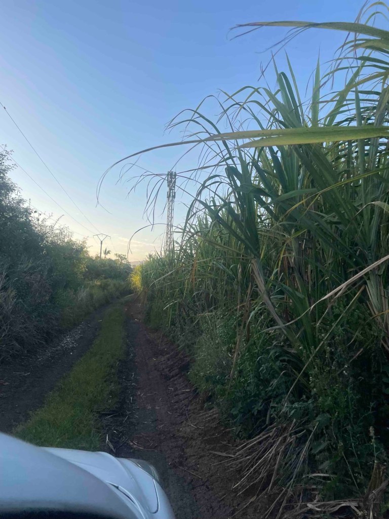 Das war die letzte Station. Der Kreis schließt sich nun endlich. Wir sind einmal rum. Auf direktem Wege sollte es nach Saint-Leu zurückgehen. Unser Navi schlägt uns einen Schleichweg vor, um den Stau von Saint-Pierre zu umgehen – was wir gern annehmen. So können wir endlich ohne Nebelwolken das Panorama von Cilaos genießen. Aber irgendwie werden wir auf eine falsche Spur geschickt und landen im Zuckerrohrfeld. Wir müssen da durch – ein zerfahrener Feldweg, die untergehende Sonne blendet und macht es uns noch schwerer, ohne Schaden diese Hürde zu passieren. Wir schaffen es mit ganz viel Geduld und Fingerspitzengefühl. Am Ende schlagen wir die Hände über dem Kopf zusammen und schütteln uns. Wie war das noch mal: No risk, no fun!