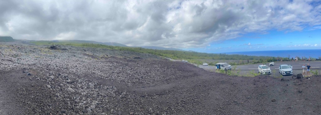 Auf der gesamten Weiterfahrt werden wir auf die verschiedenen Lavaabgänge des Piton de la Fournaise aufmerksam gemacht: Abgänge von 2001 bis 2007. Über die ersten wächst schon Gras, der von 2007 ist der letzte bisher, der das Meer erreichte. Ein riesiges Feld erstreckt sich von oben bis unten. Und der Vulkan selbst liegt eingeschlossen in einer Nebelwolke. Heimtückisch schmiedet er seinen nächsten Plan …