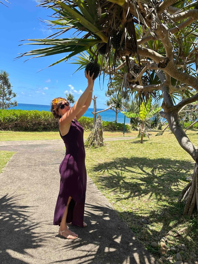 Halt an der Küste von Saint-André. Kleine Pause unter Vacoas-Palmen, Beine ausgestreckt auf dem grünen Rasen. Wir müssen aufpassen, dass wir nicht die Zeit verpassen – beim einfach nur Starren auf die dahinplatschenden Wellen.