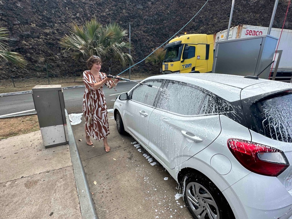 Instead, we slowly packed our suitcases and got ready for departure. We cleaned the car – as best we could – with water from canisters and a sponge. That way, we wouldn’t have to stress in the evening. The windows looked even stickier afterward, though. So, in the end, we had no choice but to head to a car wash.