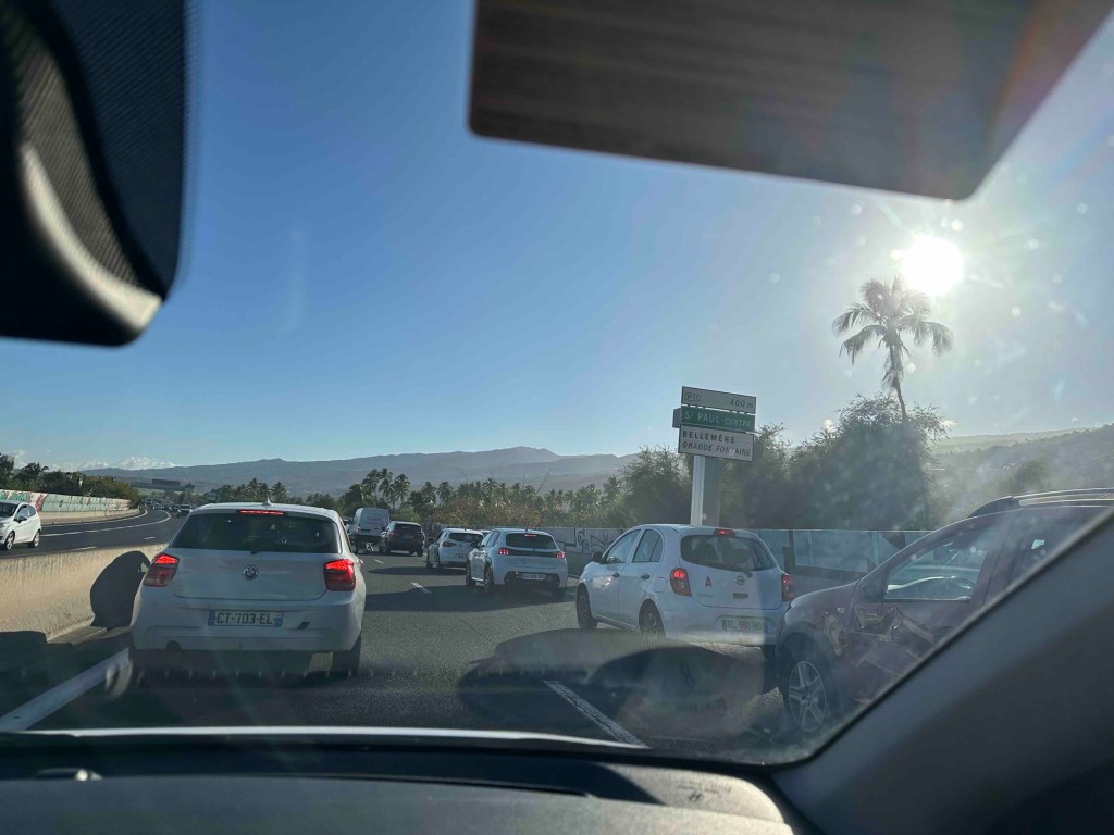 Dann die Abfahrt nach Saint-Denis zum Flughafen. Bis zur RN1 lief alles glatt, doch dann wurde auch diese Fahrt noch einmal zu einem kleinen Abenteuer: Stau von St-Leu bis Saint-Denis – über 30 km, mit einer Durchschnittsgeschwindigkeit von 20 km/h. Die prognostizierte Ankunftszeit änderte sich ständig. Am Ende brauchten wir zwei Stunden bis zum Flughafen. Es war nervig. Und was lehrt uns das? Niemals dem Navi vertrauen, wenn es irgendwelche Ausweichrouten empfiehlt – die sind natürlich ebenso verstopft.