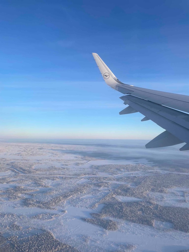 Angekommen. In der abartigen Kälte. Komplett irre! Auf dem ganzen Flug von München quer durch Deutschland, über Dänemark und Schweden: eine weiße Schicht. Im letzten Jahr fing die Landschaft erst am Finnischen Meerbusen an, sich zu verändern. In diesem Jahr scheint überall Eiszeit zu sein. Nach 3 h Flug landete der Lufthansa Airbus Neo verfrüht auf der Eispiste von Kittilä.