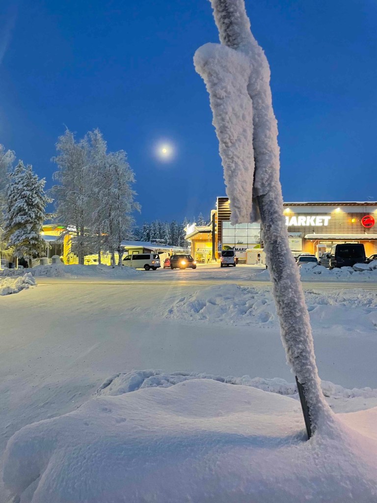 The pilot announced -30 degrees. Brutal! I had three layers on — and it still cut right through. My lungs burned a little. I wanted this, now I have to get through it. The bus to Levi was already waiting, ready to go. The bus driver: wearing a thin little jacket, no hat. That’s what you call hardened.