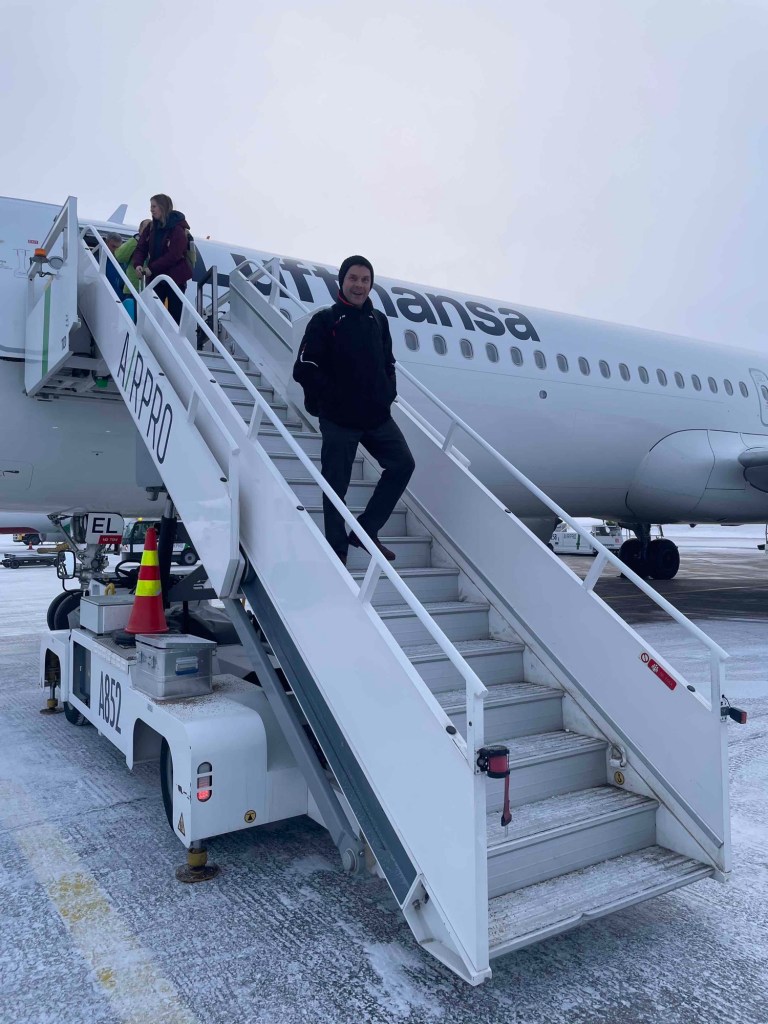 Arrived. In the outrageous cold. Completely crazy! On the whole flight from Munich across Germany, over Denmark and Sweden: a white layer everywhere. Last year, the landscape only started to change around the Gulf of Finland. This year it feels like an ice age everywhere. After 3 hours in the air, the Lufthansa Airbus Neo touched down early on the ice runway in Kittilä.